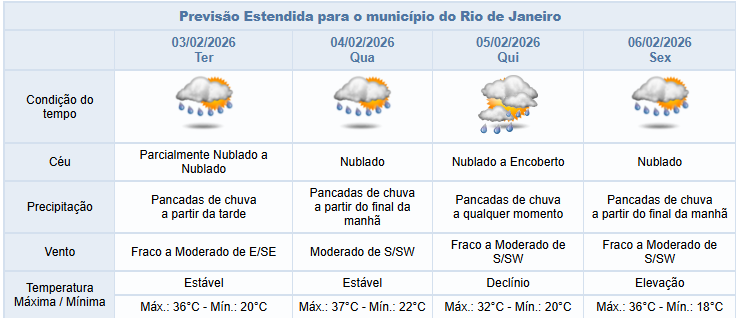Entre quarta e sexta-feira (04/02 e 06/02), áreas de instabilidade associadas à atuação de um sistema de baixa pressão, manterão o tempo instável. Há previsão de chuva fraca a moderada a qualquer momento, sendo em caráter de pancadas a partir do final da manhã, na quarta e sexta-feira e a qualquer momento da quinta-feira. Os ventos irão variar entre fracos e moderados.