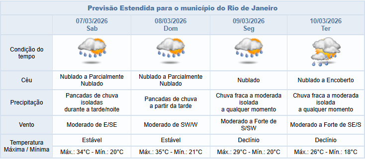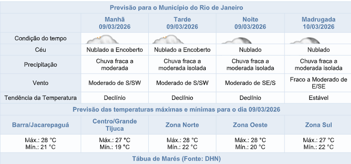 Segundo o Sistema Alerta Rio, nesta segunda-feira (09/03), as condições atmosféricas no município do Rio serão influenciadas pela passagem de uma frente fria e entrada de umidade do oceano. A previsão é de céu nublado a encoberto, com chuva fraca a moderada, isolada a qualquer momento. Os ventos estarão moderados, e as temperaturas apresentarão declínio, com máxima prevista de 28°C.