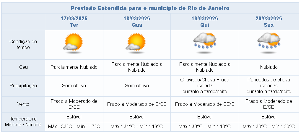 Na terça e na quarta-feira (17/03 e 18/03) a nebulosidade estará variada na cidade do Rio de Janeiro e não há previsão de chuva. Os ventos estarão fracos a moderados.