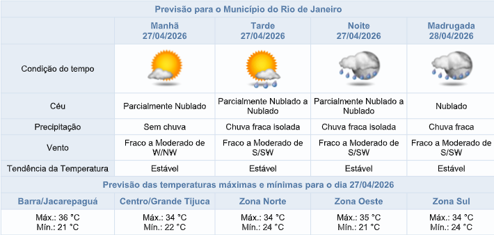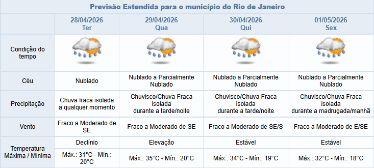 Na terça-feira (28/04), por conta da entrada de umidade do oceano, a previsão para a cidade do Rio é de céu nublado com chuva fraca isolada a qualquer momento. Os ventos estarão entre fracos a moderados.