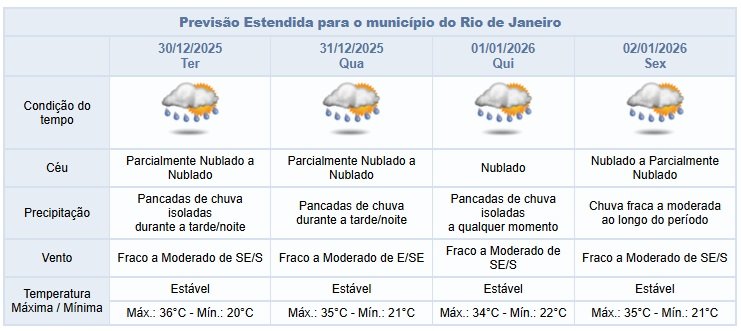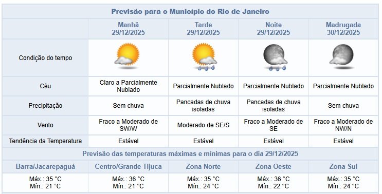 De acordo com o Alerta Rio, nesta segunda-feira (29/12) a previsão para a cidade do Rio é de céu com poucas nuvens e pancadas de chuva rápidas e isoladas na tarde/noite devido a áreas de instabilidade associadas ao calor. Os ventos estarão fracos a moderados e as temperaturas ficarão estáveis, com mínima prevista de 21°C e máxima prevista de 36°C.