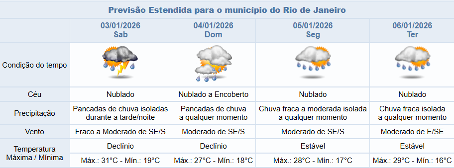 Já no domingo (04/01), haverá predomínio de céu nublado e a previsão é de pancadas de chuva a qualquer momento do dia. Os ventos estarão moderados. As temperaturas estarão em declínio.