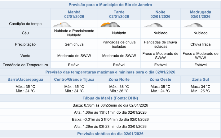 De acordo com o Sistema Alerta Rio, o tempo nesta sexta-feira (02/01) na capital fluminense será influenciado por áreas de instabilidade associadas ao calor e umidade. O céu estará parcialmente nublado a nublado e nos períodos da tarde/noite há previsão de pancadas de chuva isoladas, com raios. Os ventos devem variar entre fracos a moderados e as temperaturas seguirão estáveis e ainda elevadas, com máxima prevista de 38°C.