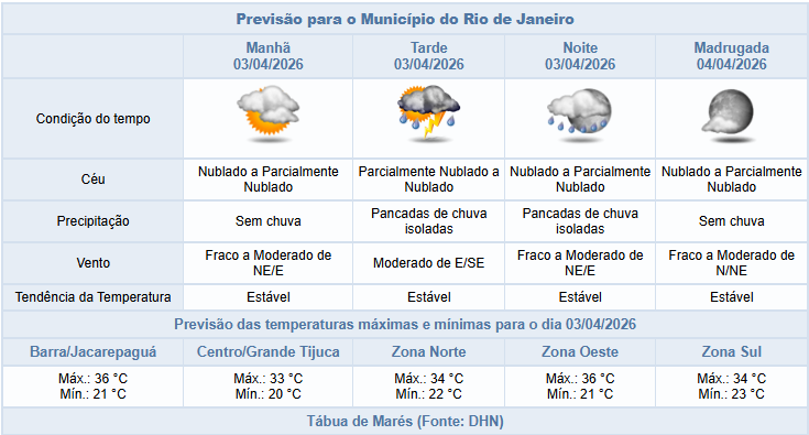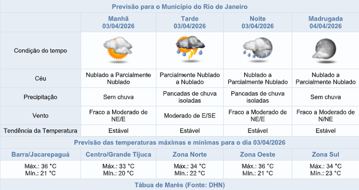 🌧️De acordo com o Sistema Alerta Rio, nesta sexta-feira de feriado (03/04) o tempo na capital fluminense será influenciado por áreas de instabilidade, em conjunto com o calor e a umidade. A nebulosidade estará variada e há previsão de pancadas de chuva isoladas acompanhadas de raios entre os períodos da tarde e da noite. Os ventos estarão entre fracos a moderados e as temperaturas seguirão estáveis e elevadas, com mínima prevista de 20°C e máxima prevista de 36°C.