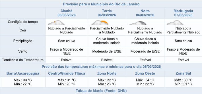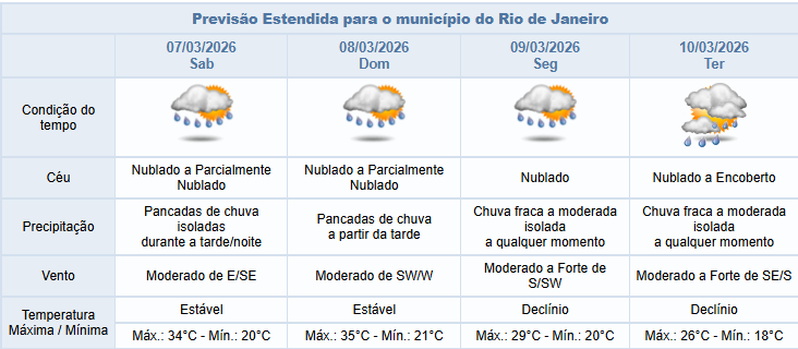 🌦️De acordo com o Sistema Alerta Rio, nesta sexta-feira (06/03), as condições atmosféricas na capital fluminense, serão influenciadas pela presença de áreas de instabilidade. Haverá nebulosidade variada ao longo do dia, com possibilidade de chuva fraca a moderada, isolada, a partir da tarde. Os ventos estarão fracos a moderados, e as temperaturas permanecerão estáveis, com máxima prevista de 34°C.