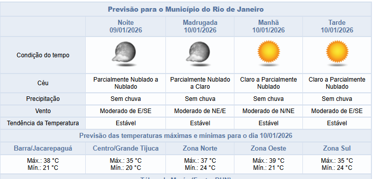 De acordo com o Alerta Rio, nesta noite de sexta-feira (09/01) o céu estará parcialmente nublado a nublado e não há previsão de chuva. Os ventos estarão moderados.