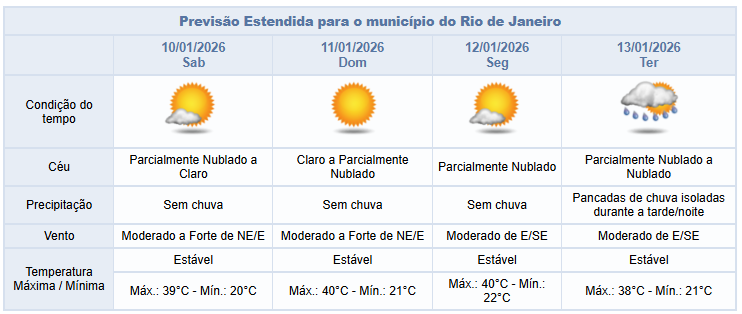 Entre o sábado e a segunda-feira (10/01 a 12/01), o céu estará com poucas nuvens e não há previsão de chuva. Os ventos estarão moderados, sendo ocasionalmente fortes no sábado e no domingo, e as temperaturas elevadas. A umidade relativa do ar poderá apresentar valores no entorno dos 30% no período da tarde desses dias.