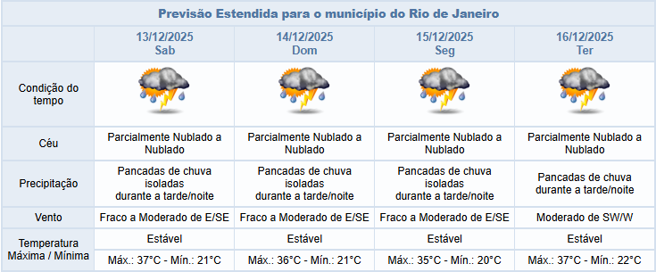Entre sábado e terça-feira (13/12 e 16/12), por conta do calor e da atuação de áreas de instabilidade, a previsão é de céu parcialmente nublado a nublado com pancadas de chuva isoladas nos períodos da tarde e noite, acompanhadas de raios. Os ventos estarão variando entre fracos e moderados.