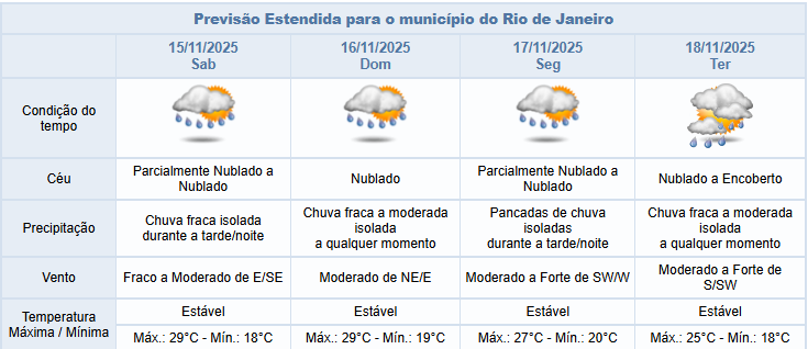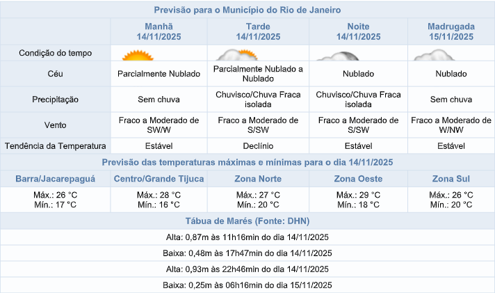Segundo o Sistema Alerta Rio, as condições atmosféricas, nesta sexta-feira (14/11), no município do Rio, serão influenciadas pela circulação de baixa pressão no litoral da região Sudeste. A nebulosidade estará variada e a previsão é de chuvisco/chuva fraca isolada na tarde e noite. Os ventos estarão fracos a moderados e as temperaturas apresentarão ligeiro declínio, com máxima prevista de 29°C.