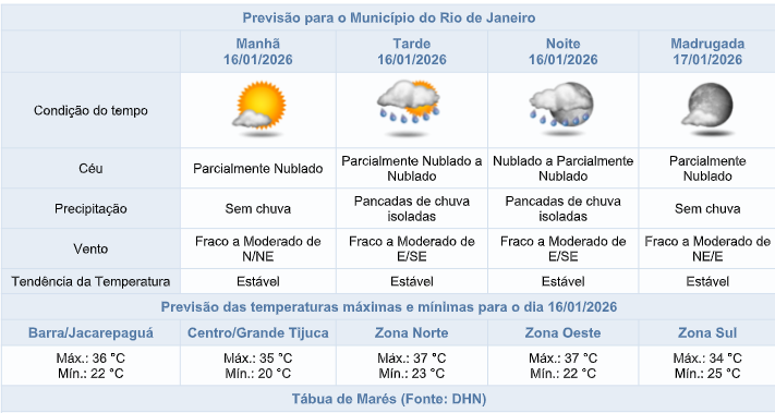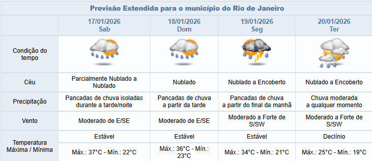 De acordo com o Sistema Alerta Rio, o tempo na capital fluminense, nesta sexta-feira (16/01), não apresentará grandes mudanças em relação aos últimos dias. A previsão é de nebulosidade variada com predomínio de céu parcialmente nublado e pancadas de chuva isoladas a partir da tarde. Os ventos estarão entre fracos e moderados, e as temperaturas estarão estáveis, com máxima prevista de 37°C.