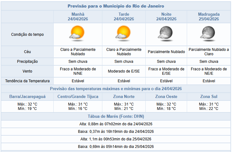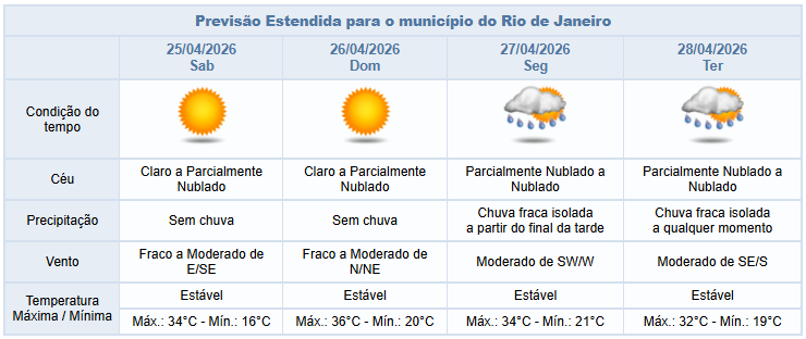 No sábado e domingo (25/4 e 26/4), a previsão para a cidade do Rio é de céu com poucas nuvens e sem chuva. Os ventos estarão fracos a moderados e as temperaturas estáveis com gradual elevação. A umidade relativa do ar poderá atingir valores entre 21% e 30% em algum ponto da cidade.