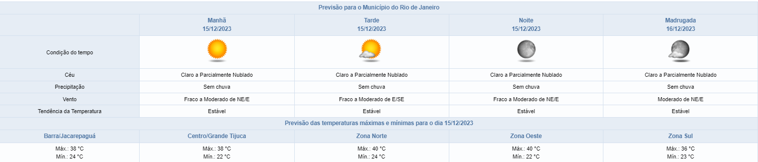 Segundo o Alerta Rio, a sexta-feira (15/12) será de tempo firme na cidade do Rio devido a um sistema de alta pressão. Assim, o céu irá variar entre claro e parcialmente nublado ao longo do dia, sem previsão de chuva. As temperaturas permanecerão estáveis e elevadas, com mínima prevista de 22°C e máxima de 40°C. Os ventos estarão fracos a moderados.
