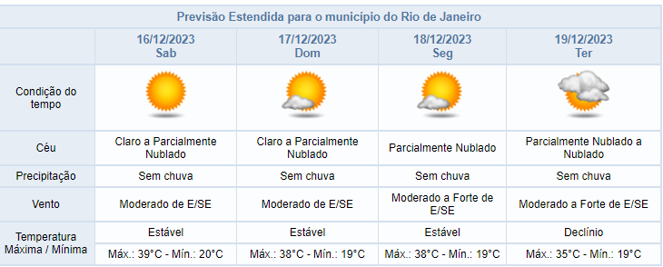 Ainda segundo o Alerta Rio, entre o sábado (16/12) e a segunda-feira (18/12), um sistema de alta pressão no oceano manterá o tempo estável na cidade e não há previsão de chuva. As temperaturas permanecerão elevadas.