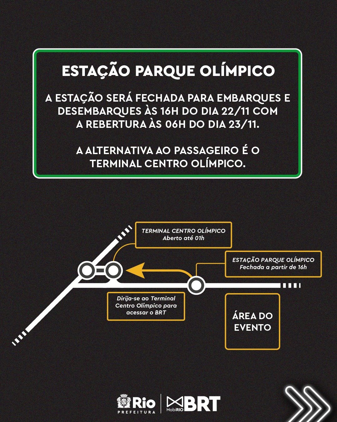 A Mobi-Rio informa que haverá esquema especial de funcionamento do BRT no dia do show. Para transportar o público que vai ao evento, o Terminal Centro Olímpico vai ficar aberto até 1h de domingo (23/11). A linha 50 (Jardim Oceânico x Terminal Centro Olímpico), que normalmente circula até 0h, também vai rodar até 1h de domingo.