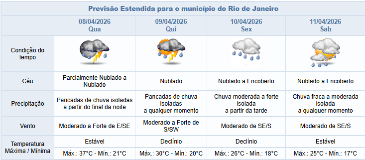 🌧️Já no sábado (11/04), o tempo na cidade do Rio permanecerá instável devido ao transporte de umidade do oceano para o continente. O céu estará nublado a encoberto e há previsão de chuva fraca a moderada isolada a qualquer momento. Os ventos estarão moderados.