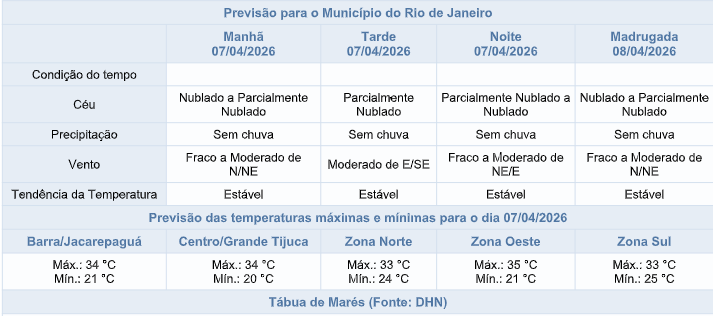 ☀️De acordo com o Sistema Alerta Rio, nesta terça-feira (07/04), o tempo na cidade do Rio será influenciado por um sistema de alta pressão no oceano. A nebulosidade estará variada, com de névoa úmida isolada no início da manhã e predomínio de céu parcialmente nublado ao longo do dia. Não há previsão de chuva e os ventos estarão fracos a moderados, sendo mais intensos no período da tarde. As temperaturas permanecerão estáveis, com mínima prevista de 20° e máxima prevista de 35°C.