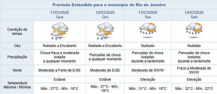 Na quinta-feira (12/03), em função de áreas de instabilidade, a previsão para a cidade do Rio é de céu nublado a encoberto com pancadas isoladas de chuva moderada a qualquer momento, sendo moderada a forte a partir da tarde. Os ventos estarão moderados.