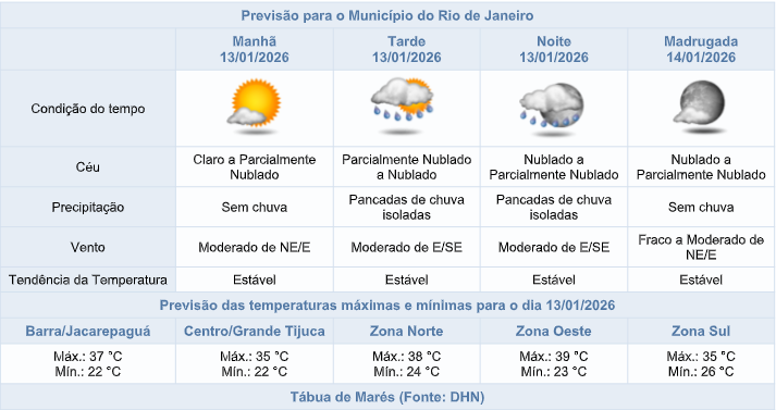 De acordo com o Alerta Rio, nesta terça-feira (13/1), em função da atuação de áreas de instabilidades associadas ao calor, a previsão para a cidade do Rio é de nebulosidade variada, com céu parcialmente nublado e pancadas de chuva isoladas na tarde e noite.