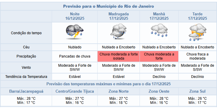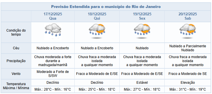 Na quarta-feira (17/12), a passagem desta frente fria e a entrada de ventos úmidos do mar manterão o tempo instável na cidade do Rio de Janeiro, com previsão de céu nublado a encoberto e chuva moderada a forte nos períodos da madrugada/manhã, passando a fraca a moderada isolada a partir da tarde. Os ventos estarão moderados a fortes e as temperaturas estarão em declínio acentuado.