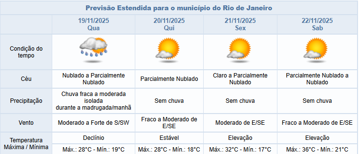Já na quinta e sexta-feira (20 e 21/11) haverá redução de nebulosidade na cidade do Rio e não há previsão de chuva nestes dias. Os ventos estarão moderados a fortes no dia na sexta-feira (21/11).