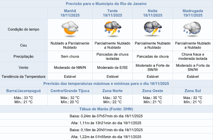 Segundo o Sistema Alerta Rio, o tempo no município do Rio, nesta terça-feira (18/11), será influenciado pela aproximação e passagem de uma frente fria em conjunto com a atuação de áreas de instabilidade. O céu estará nublado a parcialmente nublado, com previsão de pancadas de chuva nos períodos da tarde e noite, podendo vir acompanhadas de raios. Os ventos estarão moderados a fortes, sendo mais intensos durante a noite e as temperaturas seguirão estáveis e elevadas, com mínima prevista de 22°C e máxima prevista de 35°C.