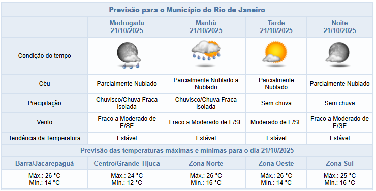 Segundo o Alerta Rio, nesta terça-feira (21/10), em função da disponibilidade de umidade na atmosfera, o dia começa com nebulosidade variada na cidade do Rio de Janeiro, predomínio de céu parcialmente nublado ao longo do dia e sem previsão de chuva. Os ventos irão variar entre fracos e moderados e as temperaturas estarão estáveis, com mínima prevista de 11°C e máxima prevista de 26°C.
