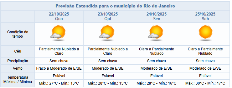 Entre a quarta-feira e sábado (22/10 e 25/10), um sistema de alta pressão irá influenciar as condições de tempo na cidade. Assim, o céu estará com poucas nuvens e não há previsão de chuva. Os ventos irão variar entre fracos e moderados, sendo mais intensos na tarde/noite desses dias.
