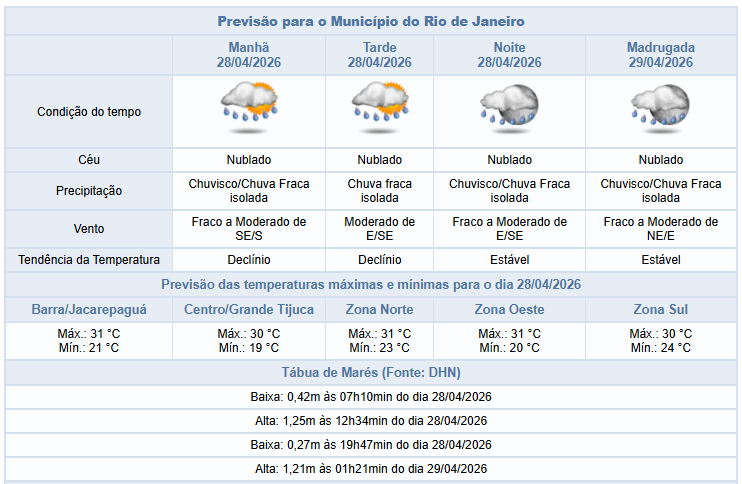 Segundo o Alerta Rio, nesta terça-feira (28/4), há previsão de chuva fraca isolada a qualquer momento do dia na cidade do Rio de Janeiro. A passagem de uma frente fria pelo oceano, associada à entrada de ventos úmidos influenciará o tempo no município e haverá predomínio de céu nublado. Os ventos estarão fracos a moderados, e as temperaturas apresentarão declínio, com mínima prevista de 19°C e máxima prevista de 31°C.
