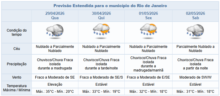 Entre a quarta-feira e a sexta-feira (29/4 e 1/5), a nebulosidade segue variada no município. A previsão é de chuvisco/chuva fraca isolada na madrugada da quarta-feira e a partir da tarde de quinta-feira até o período da manhã de sexta-feira há previsão de chuvisco/chuva fraca isolada. Os ventos estarão fracos a moderados.