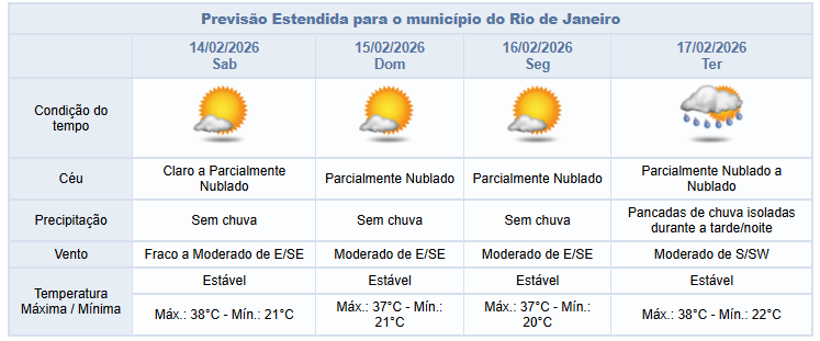 Entre o sábado e a próxima segunda-feira (14/02 e 16/02), o predomínio será de céu com poucas nuvens e não há previsão de chuva. Os ventos estarão fracos a moderados e as temperaturas permanecerão elevadas.