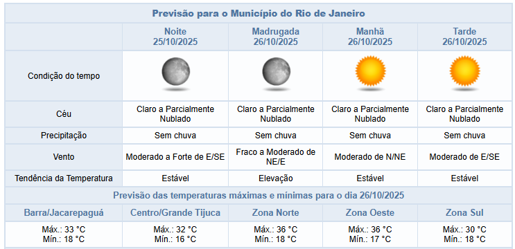 Para o fim de tarde e começo de noite deste sábado (25/10), o carioca pode esperar céu claro a parcialmente nublado, sem chuva e com ventos moderados a fortes. Ao longo do dia, o céu esteve claro a parcialmente nublado e não houve registro de chuva. Os ventos estiveram fracos a moderados durante a manhã passando a moderados no período da tarde e as temperaturas permaneceram estáveis, com mínima registrada de 15,2°C e máxima registrada de 34°C.