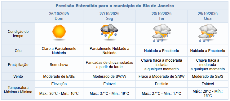 Na segunda-feira (27/10), uma região de baixa pressão no litoral do estado irá influenciar o tempo na capital fluminense. Haverá aumento de nebulosidade e há previsão de pancadas de chuva isoladas a partir da tarde, podendo vir com raios. Os ventos estarão moderados, sendo mais intensos no período da tarde e as temperaturas permanecerão elevadas.