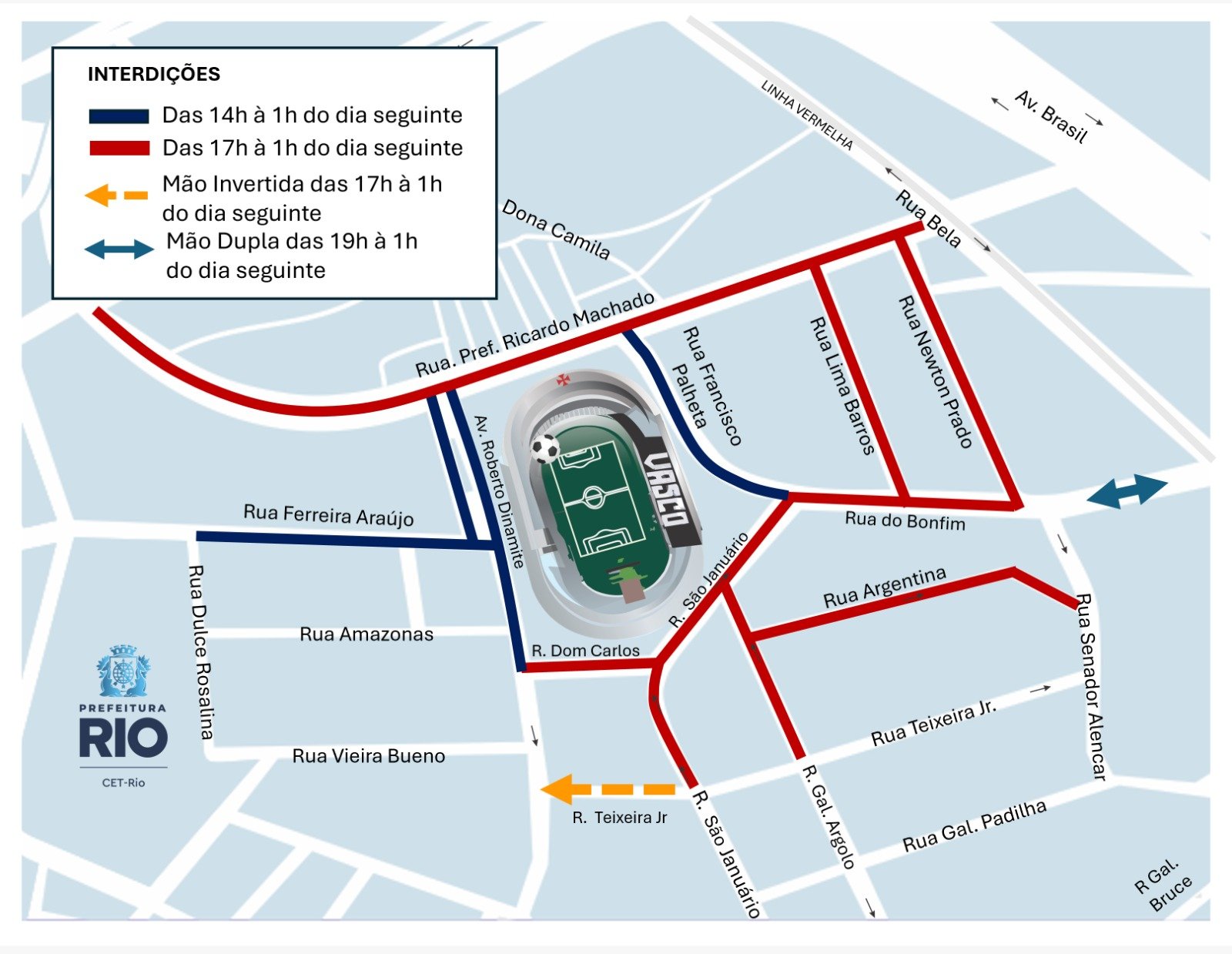 O Centro de Operações e Resiliência da Prefeitura informa que, a CET-Rio vai realizar uma operação especial de trânsito, nesta terça-feira (14/04), para o jogo entre Vasco e Audax Italiano (CHI), pela Copa Sul-Americana, que acontece às 21h, no estádio São Januário, no bairro Vasco da Gama. As interdições ao trânsito de veículos terão início às 14h.