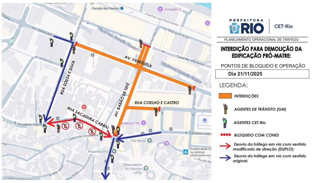 Os bloqueios acontecem das 6h às 11h, em trechos da Avenida Venezuela, Avenida Barão de Tefé e Rua Coelho e Castro. Durante a operação, a Rua Sacadura Cabral funcionará em regime de mão dupla. O estacionamento será proibido nessas vias a partir das 19h desta quinta-feira (20/11). Confira os detalhes: